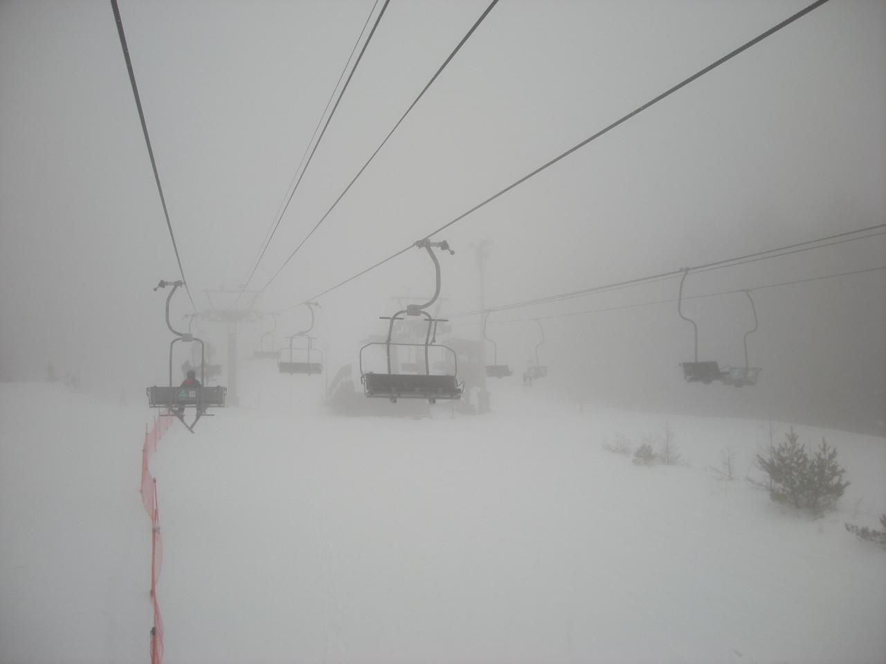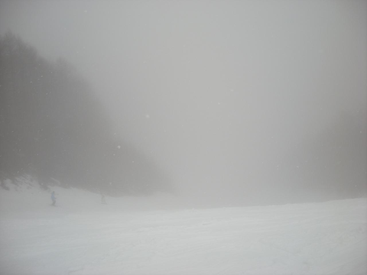 視界は相変わらず良くなかったのですが、少しだけ気温が下がってきたのか素晴らしく板が走る雪になっていて、ものすごい予想外感とともに楽しく滑ることができました。