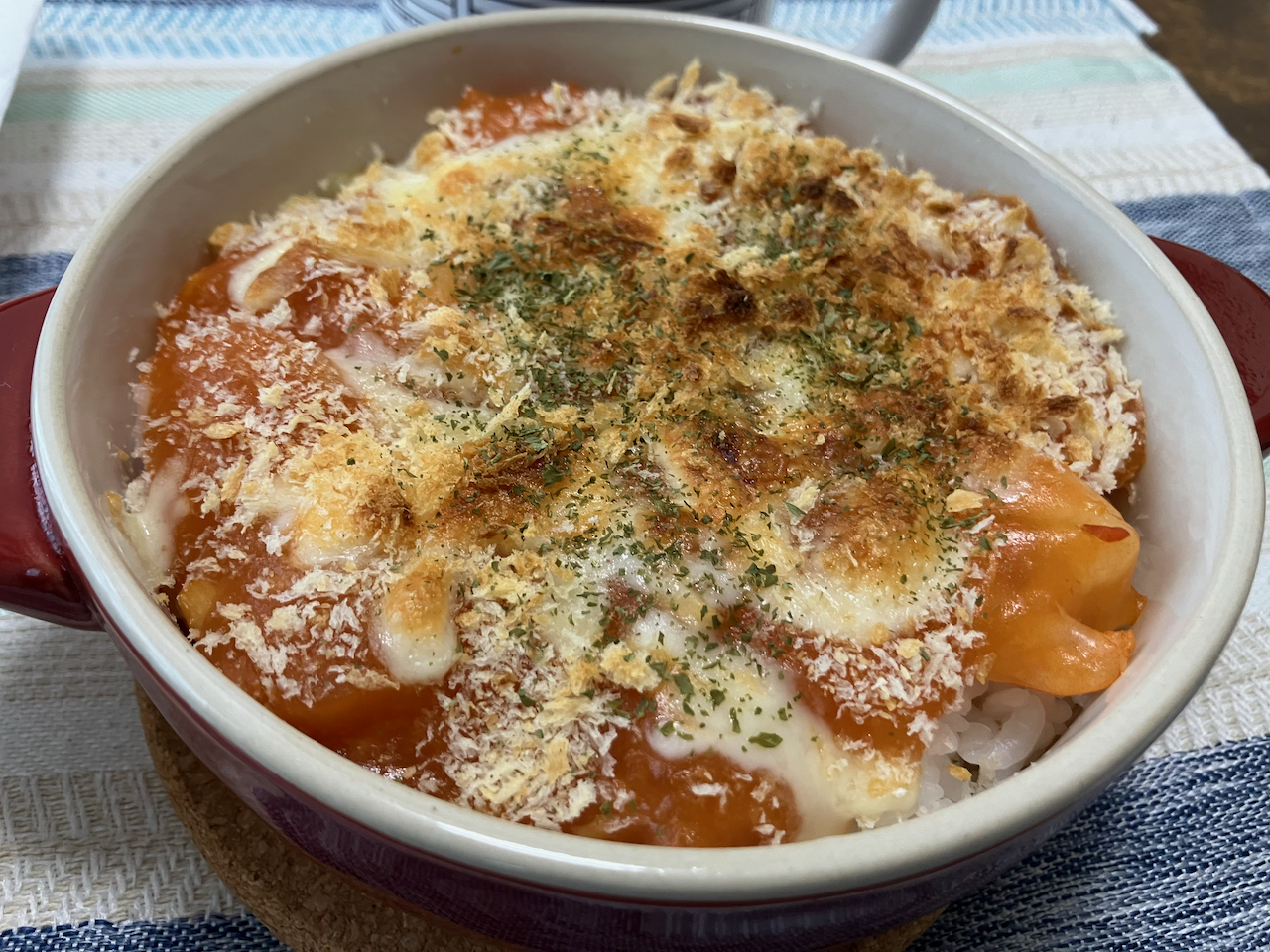 リメイクといっても、耐熱容器に御飯とえびチリを盛り、その上にチーズ & パン粉をかけてオーブントースターで焼いただけなのですけどね。