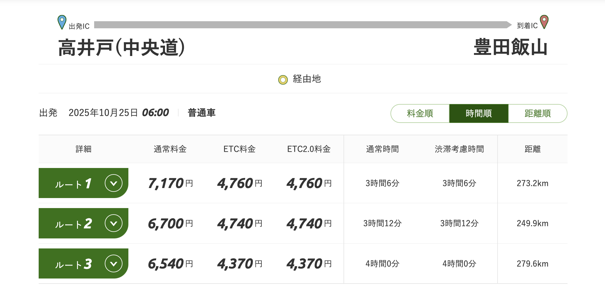 先ほどの出発 / 到着 IC の場合ならば、高井戸 IC <=> 豊田飯山 IC は3時間6分、高井戸 IC <=> 甲府昭和 IC は1時間18分と、豊田飯山 IC (長野) のほうが2.4倍近くも時間がかかってしまいます(;´Д`)
