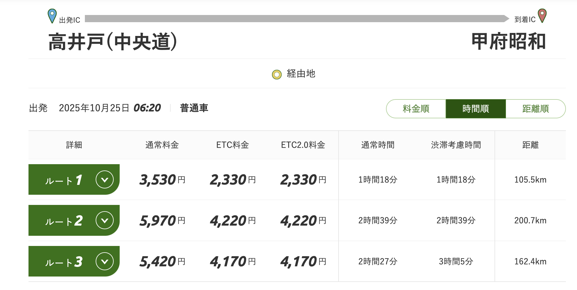 これらの数値は、高速料金は高井戸 IC <=> 甲府昭和 IC の1.3倍、所要時間は1.5倍と、ギリギリですが1.5倍のラインに収まってくれます。